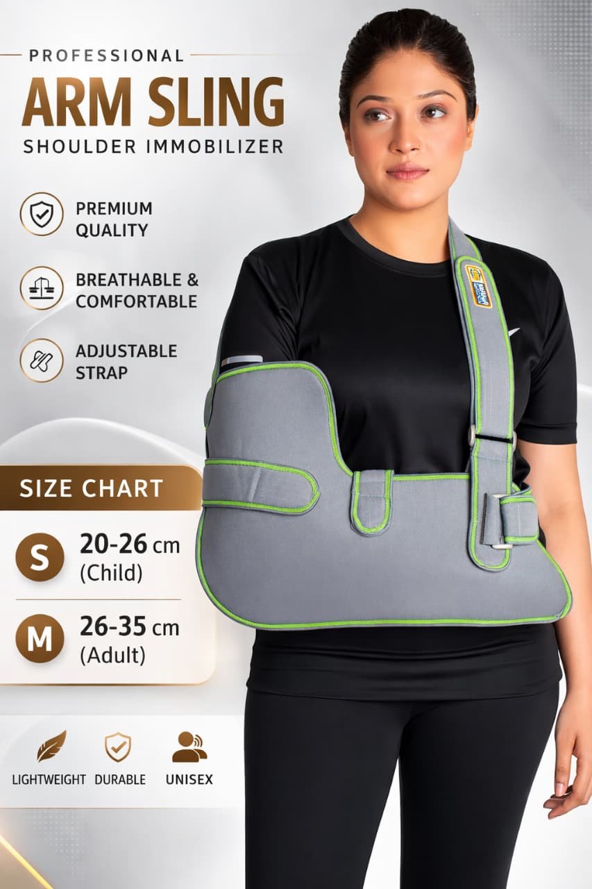 The Professional Arm Sling Shoulder Immobilizer is designed to support and stabilize the arm during injury recovery. Its breathable fabric and adjustable straps provide comfort while keeping the arm in a secure position.